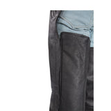 Leather chaps with gather fitting adjustment is made from top grade soft leather and has zippers running along the sides until it reaches the snaps at the bottom.